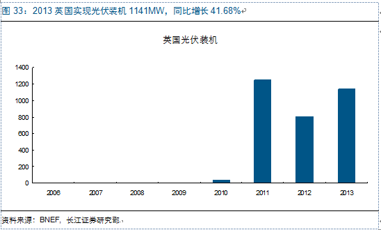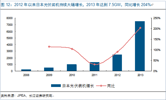 在較高的投資收益率下,2012年下半年起,日本光伏裝機快速增長,2013年保持了前期的增長趨勢,全年裝機7.5GW,同比增長204%。