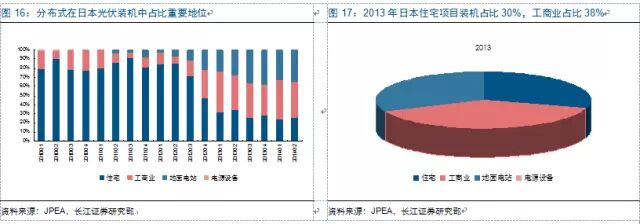高電價水平使得日本市場占比較高。從裝機類別來看,分布式在日本光伏裝機中持續(xù)占據(jù)重要地位,雖然2013年政策推動下地面電站裝機大幅增長,但分布式裝機占比依然達到68%,其中住宅項目占比30%,工商業(yè)占比38%。