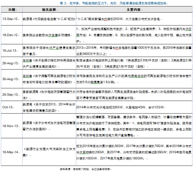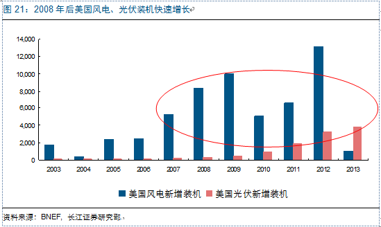 在此背景下,相比往屆政府,習李政府表現(xiàn)出了更為明顯的重視可再生能源發(fā)展的態(tài)度,國內(nèi)支持風電、光伏等可再生能源發(fā)展的政策亦持續(xù)加碼,進而帶動了2013年國內(nèi)風電行業(yè)的復蘇及光伏行業(yè)的爆發(fā)增長。