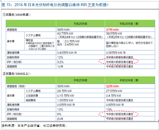 事實上,日本2014年的標桿電價政策已經(jīng)一定程度上證明了這點,根據(jù)日本產(chǎn)業(yè)經(jīng)濟省發(fā)布的政策調(diào)整參考,光伏標桿電價的調(diào)整以維持2013年的光伏電站IRR水平為前提:10KW以下項目標桿電價由38日元/千瓦時調(diào)整為37日元/千瓦時;10KW以上項目標桿電價由36日元/千萬時調(diào)整為32日元/千萬時。