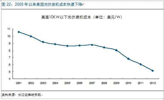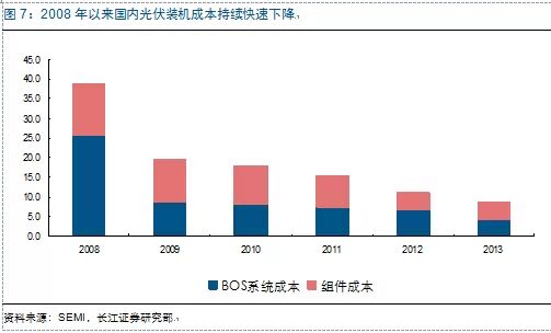 自2008年以來,國內(nèi)光伏裝機成本持續(xù)快速下降,裝機成本由2009年的20元/W下降至2013年的8.5元/W。