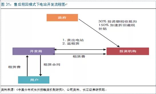 在售后回租模式下,投資機構(gòu)一次性購買開發(fā)商建造的光伏電站所有權(quán),然后返祖給開發(fā)商,開發(fā)商再租給用戶。