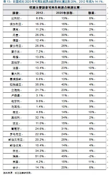 長期來看,一直以來歐盟均是全球可再生能源的引領者,較高的能源依賴及領先的環(huán)保理念是支持其可再生能源發(fā)展的主要原因,同樣也是支撐其后期可再生能源發(fā)展的主要動力,根據(jù)歐盟可再生能源規(guī)劃,規(guī)劃2020年可再生能源占能源的比重達到20%,2012年底為14.1%。