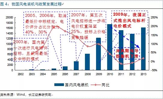 4、 2009年,我國正式出臺風電標桿電價,風電裝機實現(xiàn)規(guī)模發(fā)展,首次突破10GW水平。此后的2010年,國內(nèi)風電保持了較快的增長速度。然而,對于可再生能源缺少強有力的支持態(tài)度以及特殊的電網(wǎng)構(gòu)架等導致國內(nèi)風電棄風限電嚴重,導致2011、2012年國內(nèi)風電裝機持續(xù)下滑。