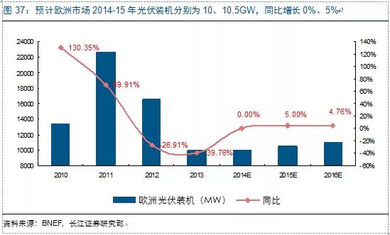 整體而言,我們預計后期歐洲市場光伏裝機將趨于平穩(wěn),2014、2015、2016年光伏裝機分別為10、10.5、11GW,分別同比增長0%、5%。