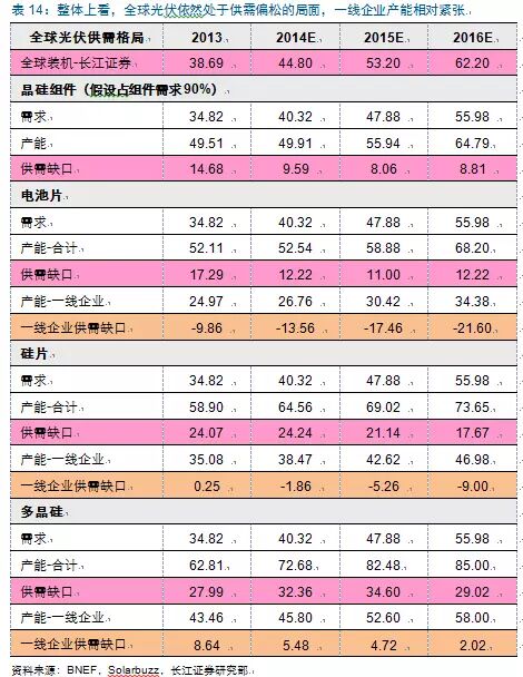 根據(jù)前面對需求的判斷以及我們對供給的統(tǒng)計,我們認為整體上,目前全球光伏依然處于供需偏松的局面,主要產(chǎn)業(yè)鏈環(huán)節(jié)多晶硅、硅片、電池、組件等均存在一定程度的產(chǎn)能過剩。不過,伴隨需求增長,一線企業(yè),尤其是龍頭企業(yè)產(chǎn)能出現(xiàn)相對偏緊的局面。