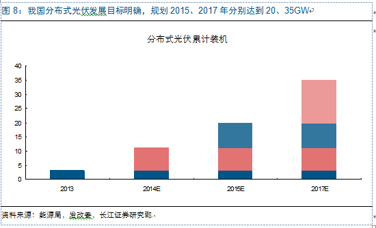 展望后期發(fā)展,我國分布式發(fā)展方向明確,短期、中期目標清晰,規(guī)模龐大。1月17日,能源局發(fā)布《關(guān)于下達2014年光伏發(fā)電年度新增建設規(guī)模的通知》,指出2014年全國光伏備案目標為14GW,其中分布式8GW,大型電站6GW;3月24日,發(fā)改委出臺《能源行業(yè)加強大氣污染防治工作方案》,進一步指出分布式中期目標:2015年達到20GW,2017年達到35GW。
