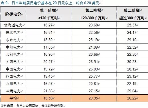 由于能源短缺及體制等原因,與其他主要發(fā)達國家相比,日本國內(nèi)電價水平相對較高,尤其是居民電價。目前,日本居民電價共分為三個用電階梯,根據(jù)我們的統(tǒng)計,日本10大電力集團第一階梯、第二階梯、第三階梯平均電價分別為18.59、23.95、26.22日元,約合0.19、0.24、0.27美元,