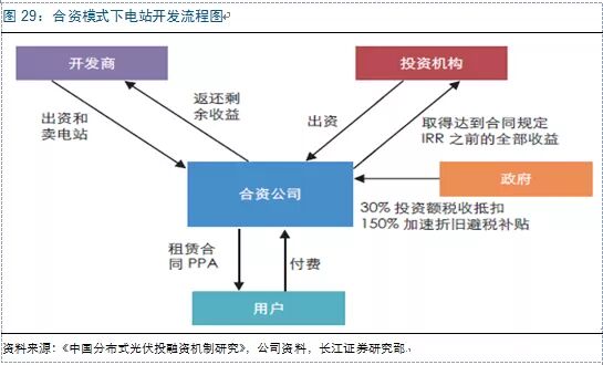 合資模式即開發(fā)商(Solarcity)和投資機構(gòu)共同出資成立合資公司,購買開發(fā)商建造的光伏電站,并與用戶簽訂PPA/租賃協(xié)議。投資收益由用戶電費或租金、稅收抵免、加速折舊避稅和電價補貼構(gòu)成。