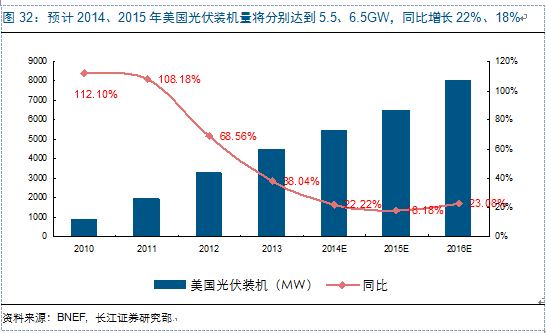綜上,我們認為美國政府的重視、相對市場化的政策以及企業(yè)的自主創(chuàng)新等將有望帶動美國光伏市場持續(xù)增長,預計美國光伏裝機仍將維持較快增長,2014、2015、2016年裝機量將有望分別達到5.5、6.5、8GW(2016年政策調(diào)整,或存在搶裝),分別同比增長22.22%、18.18%、23.08%。