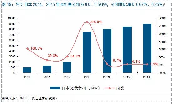 綜上,我們預計日本2014、2015、2016年光伏裝機分別為8.0、8.5、9.0GW,分別同比增長6.67%、6.25%、5.88%。