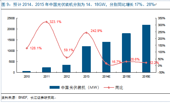 綜上,我們預計2014、2015、2016年國內(nèi)光伏裝機分別為14、18、22GW,分別同比增長17%、28%、22 %。