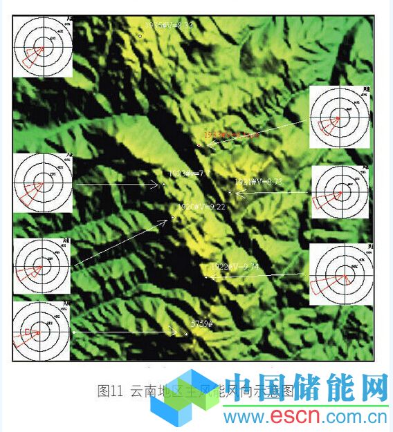 云貴高原常年西南季風(fēng),西部風(fēng)能資源好于東部。我國(guó)南方大部分地區(qū)氣候受青藏高原影響較大,冬季西風(fēng)氣流遭阻擋,分為南北兩支,形成北脊南槽的環(huán)流形勢(shì);夏季,西南季風(fēng)向北推進(jìn)時(shí),受阻于青藏高原分為兩支,一支向西,另一支沿山脈走向,流向中國(guó),擴(kuò)大西南季風(fēng)的影響范圍。故云貴地區(qū)風(fēng)向高度集中在SW、WSW,非常利于風(fēng)能資源的充分利用。圖11為云南地區(qū)主風(fēng)能風(fēng)向示意圖。