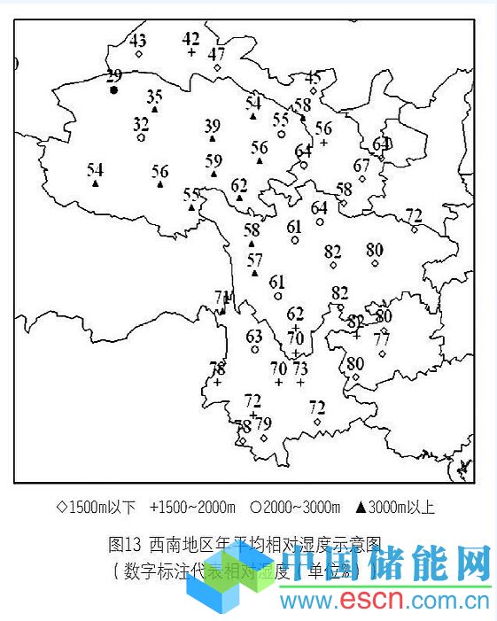 可見(jiàn),云貴高原地區(qū)相對(duì)濕度大,年平均相對(duì)濕度在70%以上,尤其高原東部的貴州地區(qū)濕度基本在80%以上,易形成冰凍、凝露等現(xiàn)象。