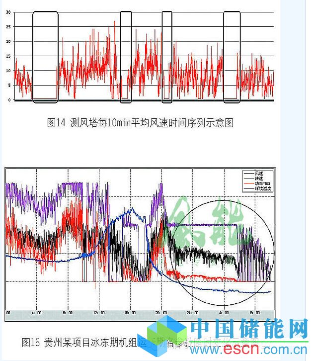 通過(guò)已運(yùn)行的貴州某風(fēng)電場(chǎng)實(shí)時(shí)監(jiān)測(cè)數(shù)據(jù),見(jiàn)下圖14和圖15,云貴地區(qū)風(fēng)電場(chǎng)面臨以下幾個(gè)問(wèn)題:(1)目前大多測(cè)風(fēng)塔測(cè)風(fēng)儀無(wú)加熱裝置,冰凍期數(shù)據(jù)基本無(wú)效,尚無(wú)客觀有效的方法進(jìn)行有效訂正,給風(fēng)能資源評(píng)估工作帶來(lái)一定的不確定性;(2)風(fēng)電機(jī)組艙頂測(cè)風(fēng)儀器易凍結(jié),導(dǎo)致機(jī)組控制系統(tǒng)失靈;(3)葉片結(jié)冰后,造成葉片翼型改變,機(jī)組出力明顯下降,同時(shí)影響葉輪的平衡,致使機(jī)組故障停機(jī),造成發(fā)電量損失;(4)結(jié)冰會(huì)影響機(jī)組載荷變化,增加部件疲勞損傷或倒塌,存在很大的安全性問(wèn)題。故在云貴高海拔地區(qū)進(jìn)行風(fēng)能資源評(píng)估工作時(shí),應(yīng)充分考慮冰凍因素并進(jìn)行相應(yīng)的風(fēng)險(xiǎn)評(píng)估,以保證機(jī)組的安全運(yùn)行。