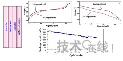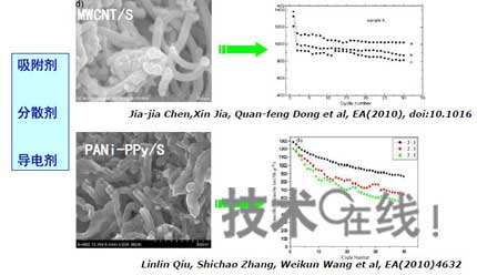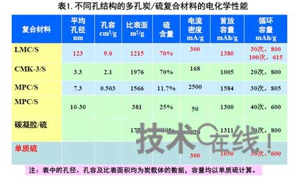 中國防化研究院的王維坤博士在9月16日于上海復(fù)旦大學(xué)舉行的“未來電動(dòng)汽車高能電源研討會(huì)”上表示,大介孔碳可通過充填單質(zhì)硫形成寄生型碳硫復(fù)合物。利用碳的高孔容(>1.5cm3/g),保證硫的高填充量,實(shí)現(xiàn)高容量;利用碳的高表面密度(>500cm2/g)吸附放電產(chǎn)物,提高循環(huán)穩(wěn)定性;利用碳的高導(dǎo)電性(幾S/cm)改善單質(zhì)硫的電絕緣性,提高硫的利用率和電池的充放電倍率性能。