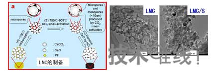 大介孔碳的制備過程是:采用納米CaCO3作模版,酚醛樹脂作碳源,經(jīng)過碳化、CO2內(nèi)活化、HCL去模版、水洗。表面密度為1215 cm2/g,孔容為9.0 cm3/g,電導(dǎo)率為23S/cm。然后,與硫在300℃高溫下共熱,制備成LMC/S材料,其中S占70%。如圖2所示。