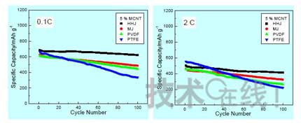 | 圖8 幾種電極粘合劑對(duì)電池性能的影響比較 |