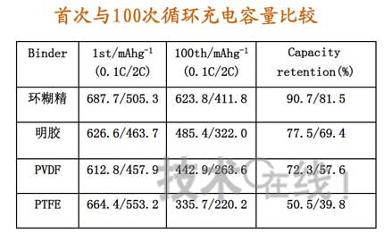 采用環(huán)糊精作電極粘合劑,因?yàn)槠錈o論在小電流還是大電流倍率下,都具有最好的循環(huán)性能。圖8和表3是幾種電極粘合劑對(duì)電池性能影響的比較。(記者 恩平)