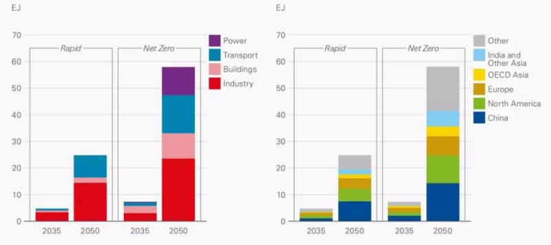 圖7 2035和2050年不同部門和不同地區(qū)氫能消費量