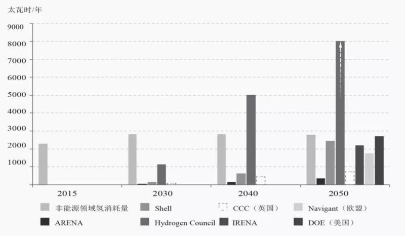 綜合各大機構(gòu)對全球氫市場的展望(見圖6),國際可再生能源署、殼牌、澳大利亞可再生能源署等機構(gòu)認為,到2050年全球氫市場規(guī)模將達到500~2000太瓦時;而國際氫能委員會則認為,屆時氫市場有望達到16100太瓦時,占世界能源總消費的18%。也就是說,如果從目前氫在非能源領(lǐng)域的消耗水平來看其未來的絕對產(chǎn)量,根據(jù)最樂觀的預(yù)測,到2050年氫產(chǎn)量有望增長6.5倍,或者說到2050年的復(fù)合年均增長率約為6%。
