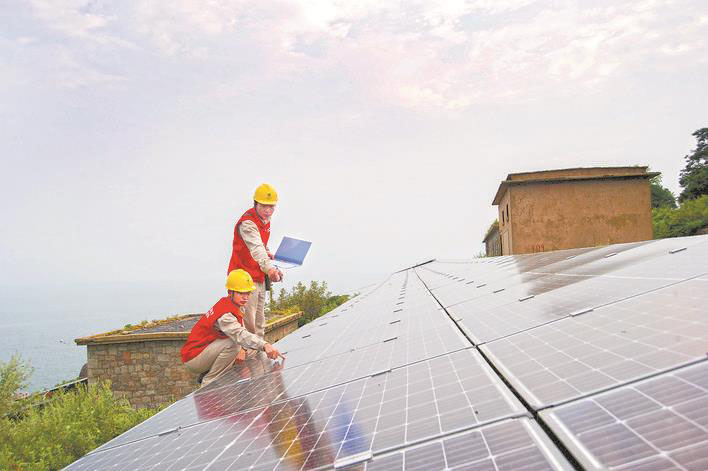 國網(wǎng)江蘇電力組織國內(nèi)氣象、地質(zhì)、水文等方面的專家,梳理分析開山島區(qū)域的歷史氣象數(shù)據(jù),根據(jù)數(shù)據(jù)結(jié)果重新設(shè)計光伏板的安裝方式,在保證足夠發(fā)電效率的基礎(chǔ)上,將光伏板安裝角度設(shè)置為2.2度。光伏板安裝完成后,從遠處看與島上建筑的屋頂渾然一體,絲毫沒有影響建筑和開山島整體外觀。