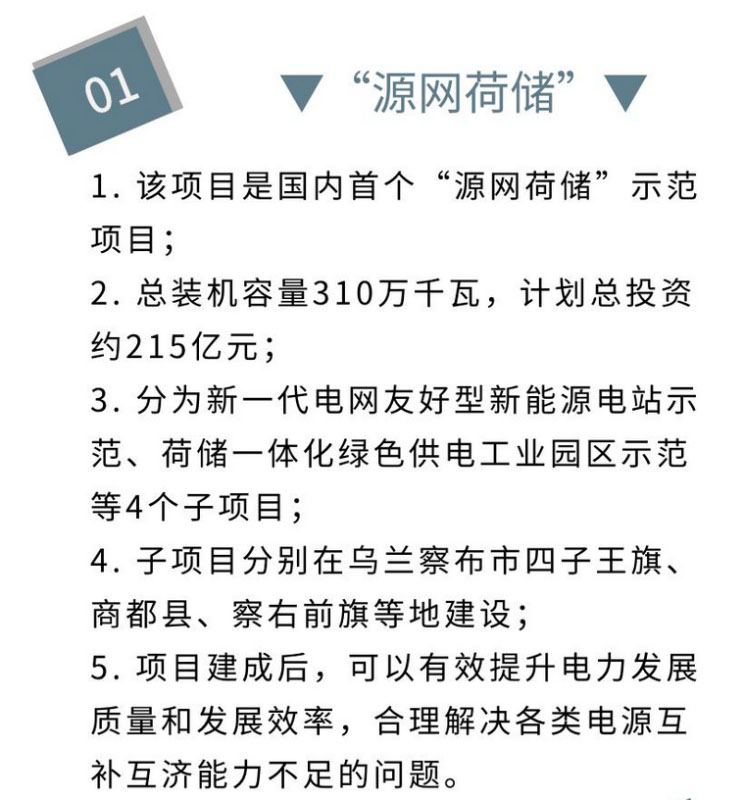 “源網(wǎng)荷儲(chǔ)”項(xiàng)目是一種包含“電源、電網(wǎng)、負(fù)荷、儲(chǔ)能”整體解決方案的運(yùn)營(yíng)模式,可精確控制用電負(fù)荷和儲(chǔ)能資源,解決清潔能源消納及其產(chǎn)生的電網(wǎng)波動(dòng)性等問題。對(duì)于烏蘭察布市就地消納清潔能源、解決地區(qū)缺電問題、促進(jìn)與電網(wǎng)友好協(xié)同發(fā)展具有重要意義。
