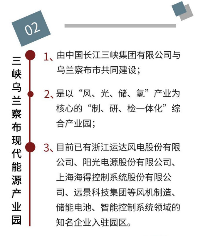三峽烏蘭察布現(xiàn)代能源產(chǎn)業(yè)園由三峽集團(tuán)與烏蘭察布市共同建設(shè),是以“風(fēng)、光、儲(chǔ)、氫”產(chǎn)業(yè)為核心的“制、研、檢一體化”綜合產(chǎn)業(yè)園,同時(shí)還融合了現(xiàn)代能源技術(shù)、物聯(lián)網(wǎng)技術(shù)和云計(jì)算等新一代信息技術(shù),利用分布式電源和儲(chǔ)能設(shè)備構(gòu)建多種綠色能源互補(bǔ)、多類型儲(chǔ)能綜合利用的智能微網(wǎng)園區(qū)。目前已有浙江運(yùn)達(dá)風(fēng)電股份有限公司、陽(yáng)光電源股份有限公司、上海海得控制系統(tǒng)股份有限公司、遠(yuǎn)景科技集團(tuán)等風(fēng)機(jī)制造、儲(chǔ)能電池、智能控制系統(tǒng)領(lǐng)域的知名企業(yè)入駐園區(qū),各方強(qiáng)強(qiáng)聯(lián)合,共同推進(jìn)現(xiàn)代能源產(chǎn)業(yè)體系建設(shè)。