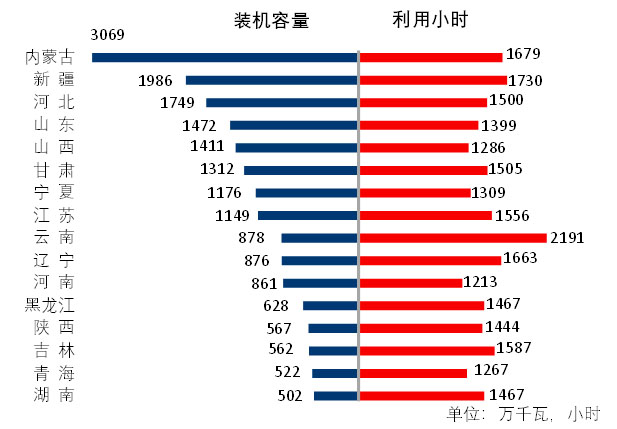 圖3 1-9月份風(fēng)電裝機(jī)較多省份風(fēng)電裝機(jī)容量和設(shè)備利用小時(shí)