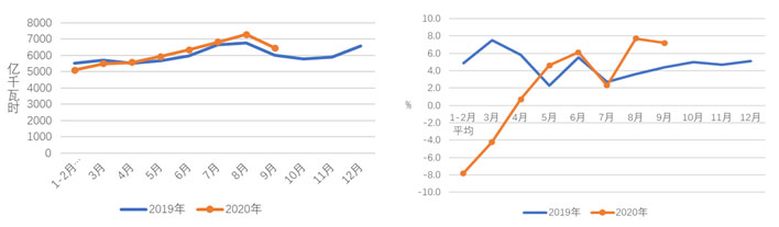 圖1 2019、2020年分月全社會(huì)用電量及其增速