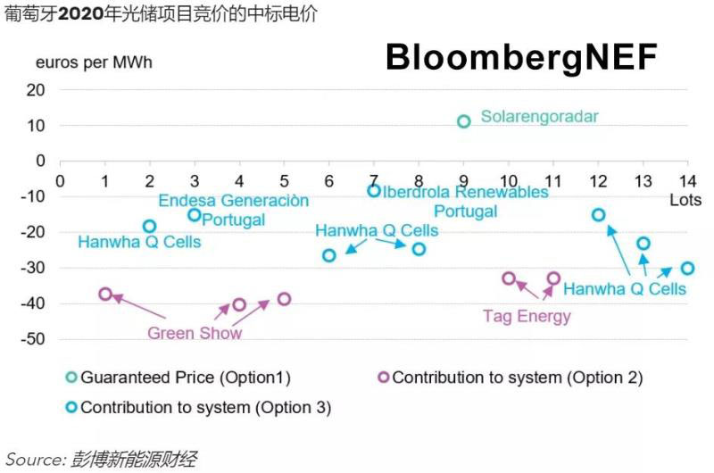 在葡萄牙,第二次競(jìng)價(jià)首次為配套儲(chǔ)能的大型地面光伏電站的項(xiàng)目提供了新的并網(wǎng)途徑,光儲(chǔ)項(xiàng)目可參與新的"靈活性 "類別下的容量競(jìng)價(jià)。競(jìng)價(jià)因此吸引了大量開發(fā)商參與投標(biāo),其中有483MW的光伏項(xiàng)目將在場(chǎng)內(nèi)安裝儲(chǔ)能,且其申報(bào)容量電價(jià)全部為負(fù),意味著開發(fā)商將向電網(wǎng)運(yùn)營(yíng)商支付8.2-30.2歐元/兆瓦時(shí),以換取項(xiàng)目并網(wǎng)。
