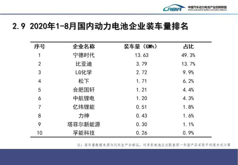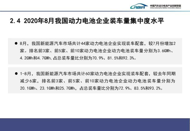 企業(yè)集中度水平,2020年8月我國(guó)新能源汽車市場(chǎng)共計(jì)44家動(dòng)力電池企業(yè)實(shí)現(xiàn)裝車配套,較7月份增加2家。排名前3家、前5家、前10家動(dòng)力電池企業(yè)動(dòng)力電池裝車量分別為3.6GWh、4.2GWh和4.7GWh,占總裝車量比分別為70.9%、81.5%和92.3%。