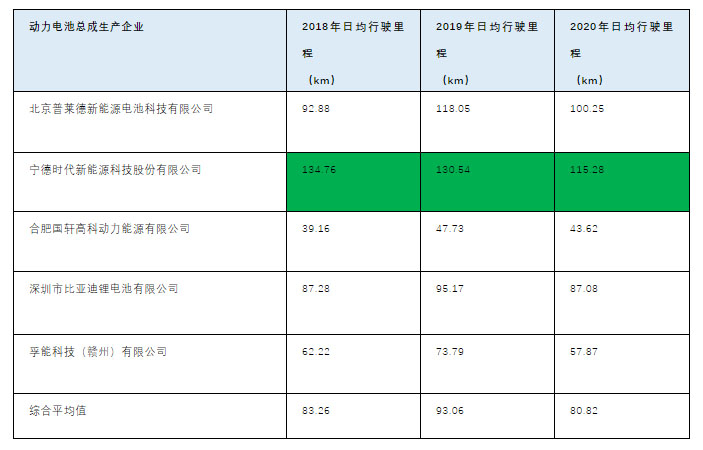 通過裝機量整體排名靠前的動力電池總成生產(chǎn)企業(yè)2018-2020年的日均行駛里程來看,采用前5名電池總成企業(yè)的車型綜合日均行駛里程有一定波動,2018年為83.26km,2019年為93.06km,2020年為80.82km。從典型企業(yè)來看,采用寧德時代電池總成的車型日均行駛里程基本穩(wěn)定在110km以上。