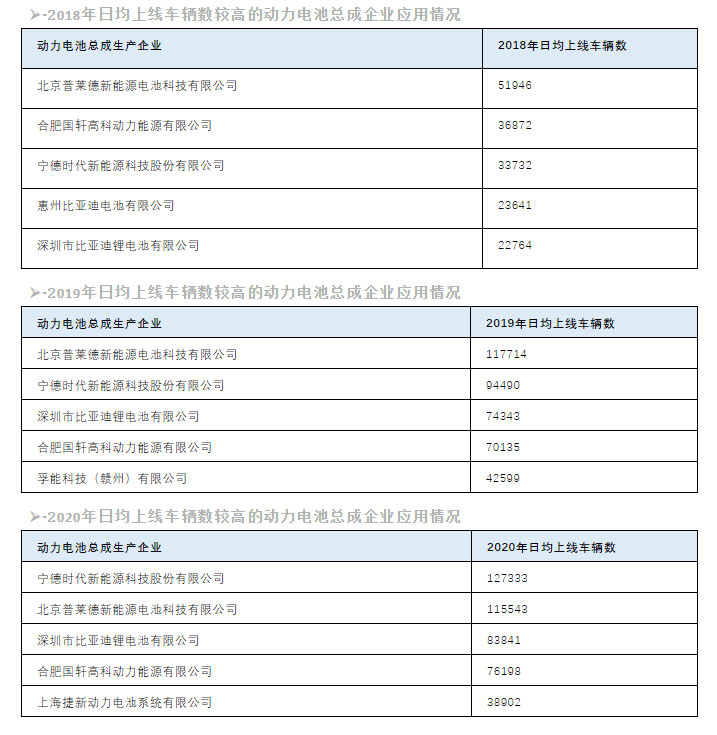 通過裝機量整體排名靠前的動力電池總成生產(chǎn)企業(yè)2018-2020年的日均上線車輛數(shù)來看,采用前5名電池總成企業(yè)的車型綜合日均上線車輛數(shù)逐年增加,從2018年的33375輛提升到2020年的88118輛。從典型企業(yè)來看,采用寧德時代、國軒高科、深圳比亞迪電池總成的車型日均上線車輛數(shù)逐年增加,2019年和2020年相比2018年的整體增幅明顯。