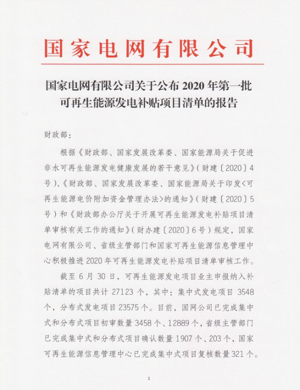 關(guān)于公布2020年第一批可再生能源發(fā)電補(bǔ)貼項(xiàng)目清單的公告