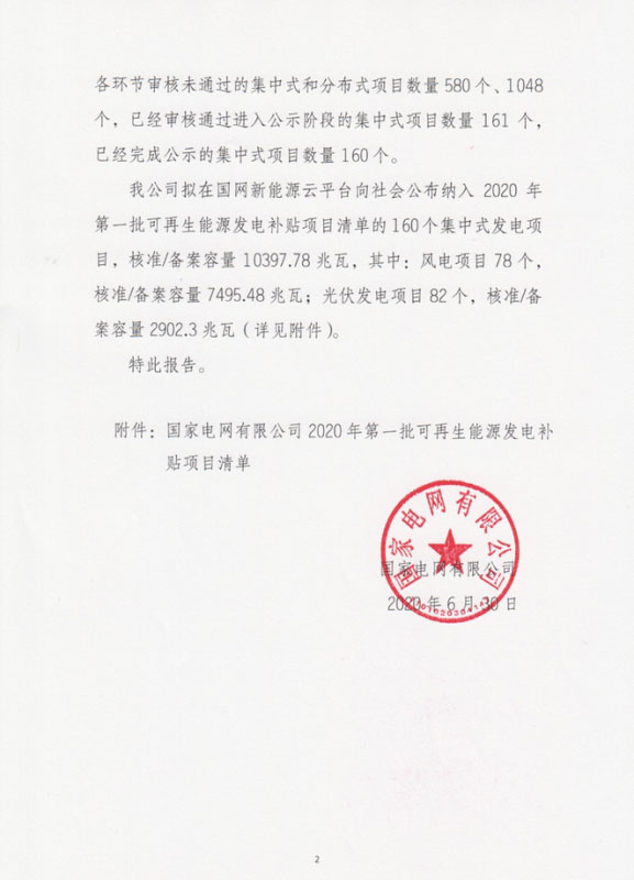 2020年6月30日,我公司已將完成公示的第一批次可再生能源發(fā)電項(xiàng)目補(bǔ)貼項(xiàng)目清單上報(bào)國家主管部門,后續(xù)將陸續(xù)完成首批(詳見財(cái)辦建〔2020〕6號(hào)有關(guān)規(guī)定)補(bǔ)助項(xiàng)目清單審核發(fā)布工作。第一批次項(xiàng)目清單及首批后續(xù)項(xiàng)目審核進(jìn)展情況,請登錄新能源云平臺(tái)查詢。