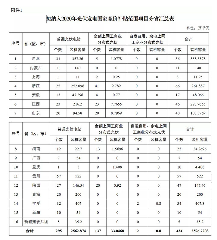 一、遵循公平、公正原則,經(jīng)委托國家可再生能源信息管理中心對各省能源主管部門審核申報項目進行復(fù)核、競價排序,擬將河北、內(nèi)蒙古等15個省(區(qū)、市)和新疆生產(chǎn)建設(shè)兵團的434個項目納入2020年國家競價補貼范圍,總裝機容量2596.7208萬千瓦,其中普通光伏電站295個、裝機容量2562.874萬千瓦,工商業(yè)分布式光伏發(fā)電項目139個、裝機容量33.8468萬千瓦,具體名單在國家能源局網(wǎng)站上予以公布。各項目按要求建成并網(wǎng)后依政策納入國家競價補貼范圍,享受國家補貼。鼓勵未納入競價補貼范圍的申報項目在企業(yè)自愿的基礎(chǔ)上轉(zhuǎn)為平價上網(wǎng)項目。
