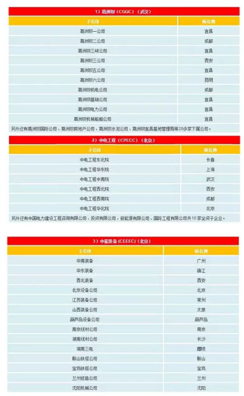 1)中國(guó)水電(SINOHYDRO),中國(guó)水利水電建設(shè)集團(tuán)公司,前身為燃料工業(yè)部水力發(fā)電建設(shè)總局,后幾經(jīng)合并與拆分,2002年12月改組為中國(guó)水利水電建設(shè)集團(tuán)公司,2009年11月整體改制并控股創(chuàng)立中國(guó)水利水電建設(shè)股份有限公司,2011年成為中國(guó)電建全資子公司??偛勘本?。