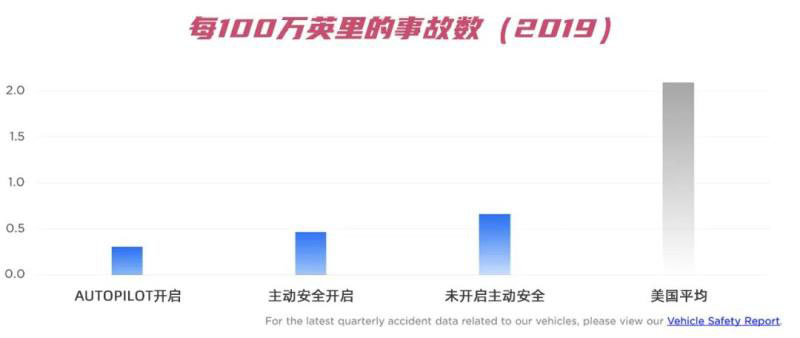 2019年,在美國,一輛參與自動駕駛的特斯拉汽車每行駛100萬英里發(fā)生0.3起事故,而美國的平均水平則高出約6倍,平均每100萬英里2起事故。即使在只啟用主動安全功能的情況下,特斯拉車輛在2019年的碰撞率也比美國平均水平低4.5倍。