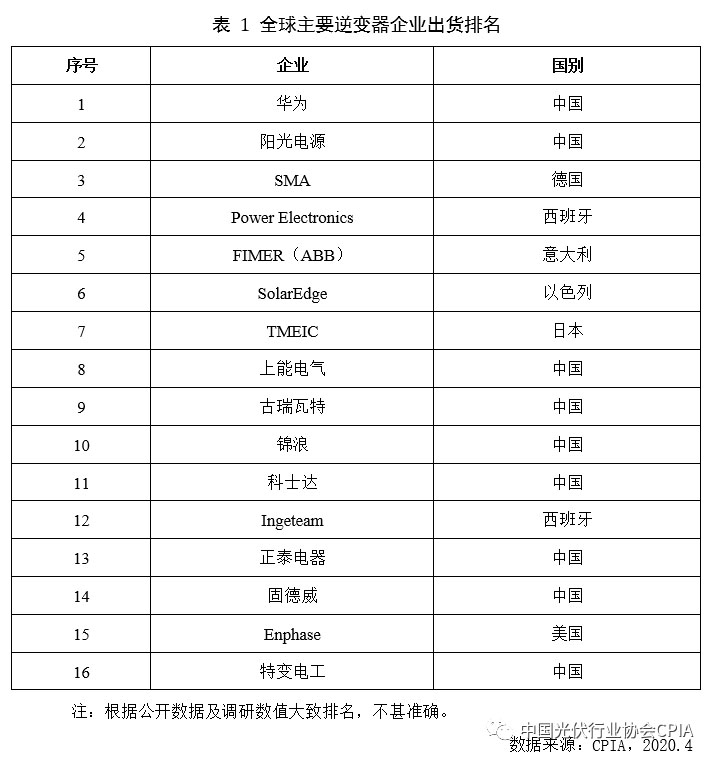 從市場競爭格局來看,中國的陽光電源、華為以及德國SMA三家逆變器企業(yè)2019年市場占有率依然位列前三甲,其中,陽光電源2019年全球光伏逆變器出貨量高達17.1GW;SMA2019年全球光伏逆變器出貨量有所突破,達到11.4GW;華為憑借品牌知名度以及全球銷售和服務(wù)渠道優(yōu)勢,2019年在歐洲市場表現(xiàn)出色,占華為出口的50%左右。協(xié)會對有公開數(shù)據(jù)來源的部分企業(yè)出貨排名統(tǒng)計如下。