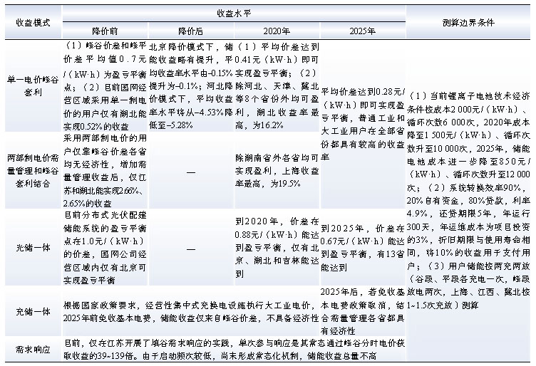 (3)對于客戶側(cè)儲能,需量管理和峰谷價差共同回收模式下,儲能盈利性水平主要與峰谷價差、儲能投資建設(shè)成本、循環(huán)次數(shù)、充放電模式、用戶分成比例以及對需量降低的效率影響等指標(biāo)有關(guān)。通過建立儲能成本分析模式進(jìn)行經(jīng)濟(jì)性測算,當(dāng)前,普通工業(yè)和大工業(yè)用戶安裝儲能僅少部分省份能實(shí)現(xiàn)盈虧平衡,隨著儲能技術(shù)經(jīng)濟(jì)性提升,按工業(yè)電價降價前目錄電價計算,2020年已具有較好的盈利性。按照2019年工業(yè)電價水平下降要求,在北京市降價模式下(峰、平、谷價格統(tǒng)一下降同一額度,峰谷價差和峰平價差保持不變),儲能收益略有提升,在多數(shù)省份采用的河北省降價模式下(下降比例基本相同,峰谷價差和峰平價差縮?。?,儲能收益將明顯下降。