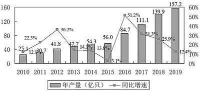 2010-2019年我國(guó)鋰離子電池產(chǎn)量和同比增速