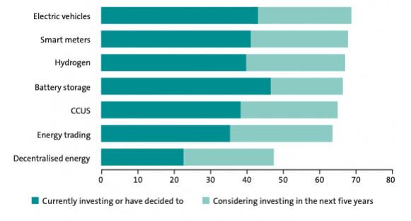 智能電表和氫儲能在當前和計劃投資模式中也表現(xiàn)突出,分別有41%和40%的受訪者選擇這兩種非發(fā)電能源技術(shù)。