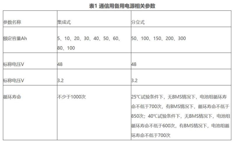 通信基站出于安全方面的考慮,對(duì)電池材料進(jìn)行了限制,僅使用磷酸鐵鋰電池。電池分為分立式和集成式兩種,兩者的區(qū)別在于電池模塊與電池管理系統(tǒng)是否集成為一體。廢舊電池在這兩種形式的電源上均能實(shí)現(xiàn)梯次利用,對(duì)比兩種電源的相關(guān)標(biāo)準(zhǔn)(YD/T?2344.1—2011 通信用磷酸鐵鋰電池組?第1部分:集成式電池組、YD/T 2344.2-2015 通信用磷酸鐵鋰電池組 第2部分:分立式電池組),可以看出兩者僅在循環(huán)壽命的要求上存在較大差異,其他指標(biāo)要求幾乎相同。