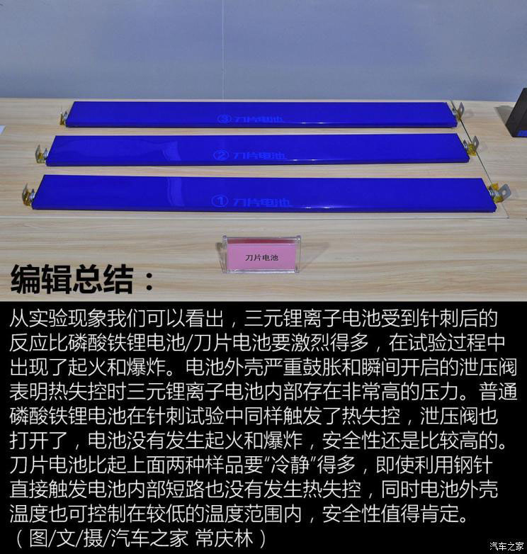 三元鋰離子電池單體的熱失控安全系數(shù)較低,但通過(guò)加強(qiáng)電池包殼體的強(qiáng)度,完善電池管理系統(tǒng)對(duì)熱失控的檢測(cè)和提前預(yù)警機(jī)制,利用隔熱絕緣材料降低熱擴(kuò)散速率等都能有效地增強(qiáng)電池包的整體安全系數(shù),以滿足國(guó)標(biāo)對(duì)車用動(dòng)力電池的安全性要求,提升其使用層面的安全性。磷酸鐵鋰電池/刀片電池能量密度相對(duì)較低,但其熱失控安全系數(shù)比三元鋰離子電池高不少,這有利于使用無(wú)模組設(shè)計(jì)來(lái)進(jìn)一步提升電池包整體能量密度,增加電動(dòng)車的續(xù)航里程,從而在安全性和續(xù)航上實(shí)現(xiàn)更好的平衡。(圖/文/攝/汽車之家 常慶林)