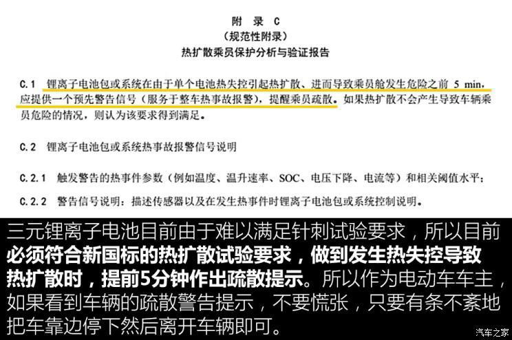 從車輛使用安全的角度出發(fā),新國(guó)標(biāo)新增了熱擴(kuò)散試驗(yàn),要求電池包或電池單體發(fā)生熱失控引起熱擴(kuò)散,進(jìn)而導(dǎo)致乘員艙發(fā)生危險(xiǎn)之前5分鐘,為乘員提供一個(gè)預(yù)先警告信號(hào),提醒乘員疏散。熱擴(kuò)散試驗(yàn)的目的就是為了提升電動(dòng)車在使用層面的安全性,保證使用者的人身安全。
