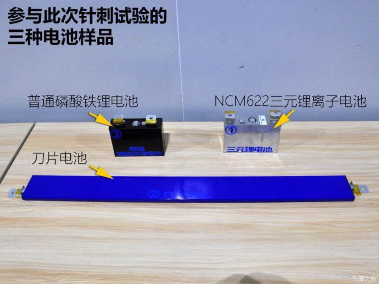 此次針刺試驗(yàn)除了有比亞迪最新的刀片電池外,作為對(duì)比,我們也找來(lái)普通磷酸鐵鋰電池、NCM622三元鋰離子電池(正極材料中的鎳鈷錳三種成分的比例為6:2:2)進(jìn)行試驗(yàn)。我們要看看這三種電池在嚴(yán)酷的針刺試驗(yàn)下,都有怎樣的表現(xiàn)。