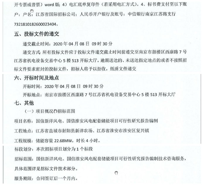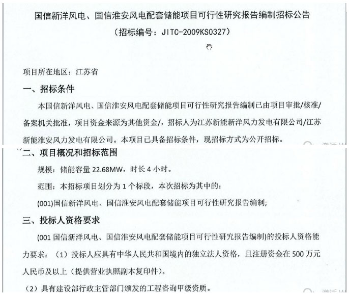 附國信新洋風(fēng)電、國信淮安風(fēng)電配套儲能項目可行性研究報告編制招標(biāo)公告: