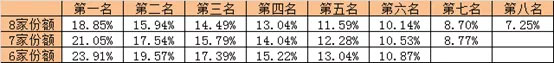 當(dāng)中標(biāo)人數(shù)量為6家時(shí),每個(gè)中標(biāo)人對應(yīng)的中標(biāo)份額依次為:第一名中標(biāo)份額為23.91%、第二名中標(biāo)份額為19.57%、第三名中標(biāo)份額為17.39%、第四名中標(biāo)份額為15.22%、第五名中標(biāo)份額為13.04%、第六名中標(biāo)份額為10.87%。