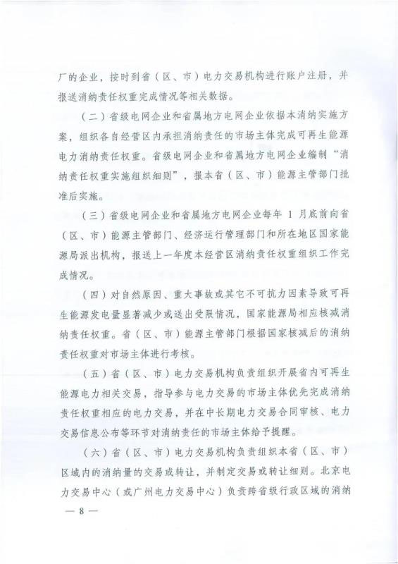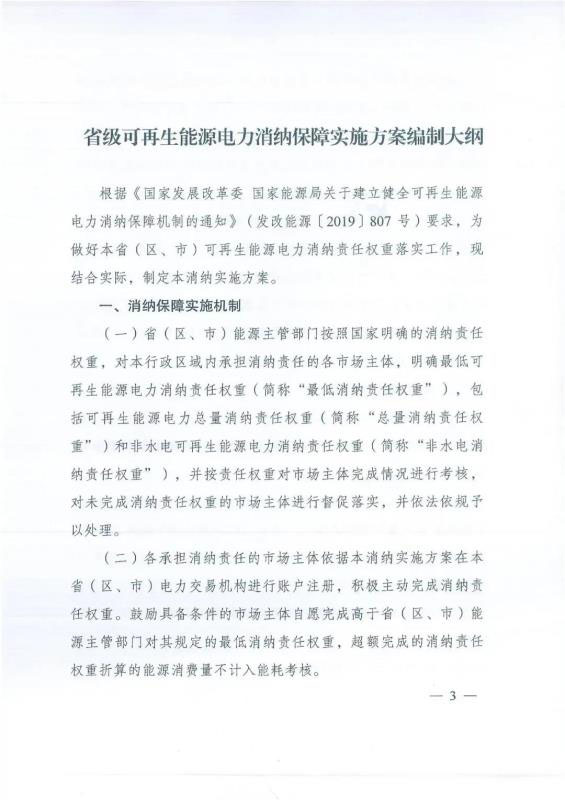 中國儲能網(wǎng)訊:日前,國家發(fā)改委辦公廳、國家能源局綜合司印發(fā)《省級可再生能源電力消納保障實(shí)施方案編制大綱的通知》,為省級能源主管部門編制本地區(qū)方案提供參考。根據(jù)大綱,?。▍^(qū)、市)能源主管部門按照國家明確的消納責(zé)任權(quán)重,對行政區(qū)域內(nèi)承擔(dān)消納責(zé)任的各市場主體,明確最低可再生能源電力消納責(zé)任權(quán)重,并按責(zé)任權(quán)重進(jìn)行考核,對未完成的市場主體進(jìn)行督促落實(shí),并依法依規(guī)予以處理。